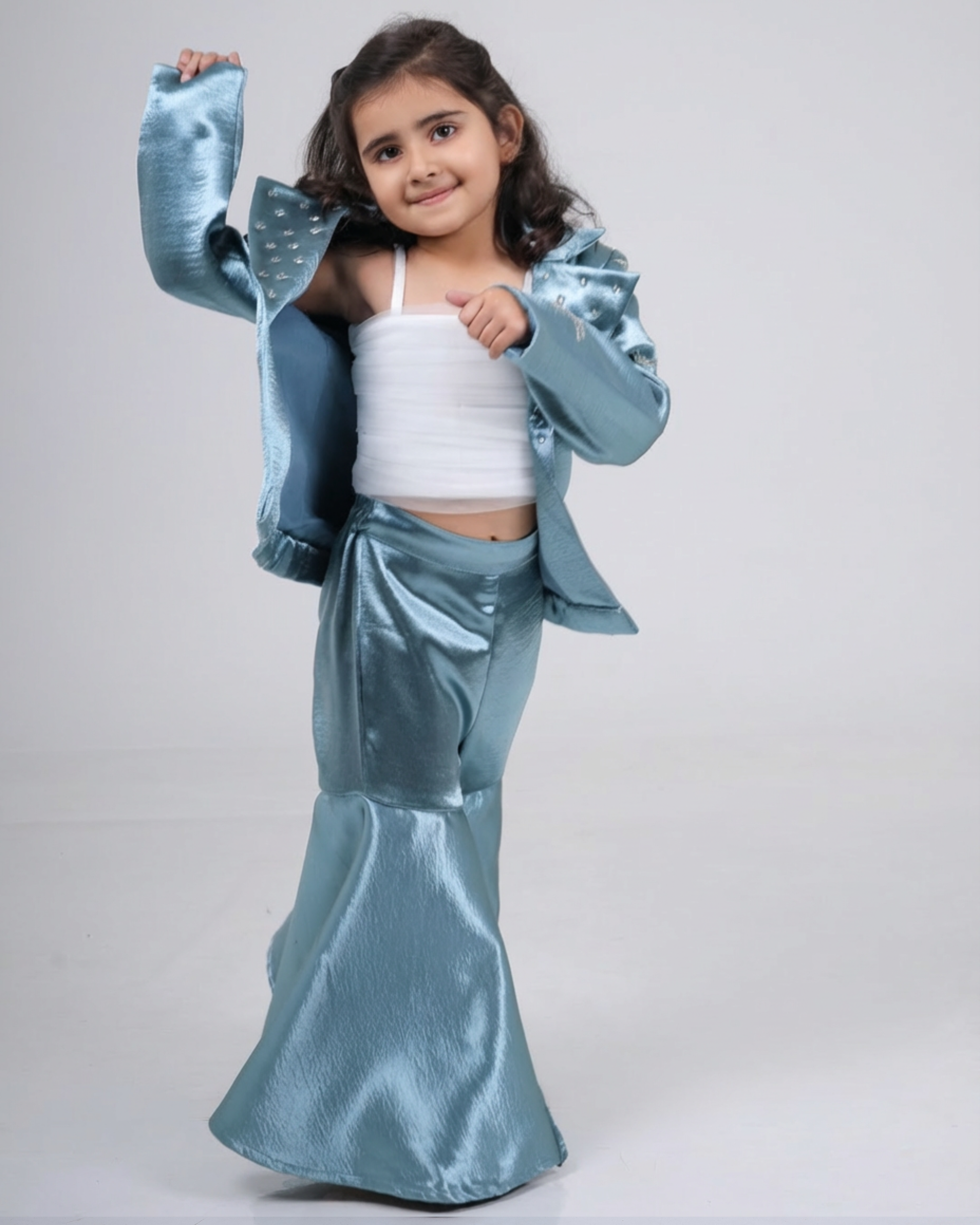 Featuring Blazer set in soft mettalica fabric with flared palazzo and soft net blouse