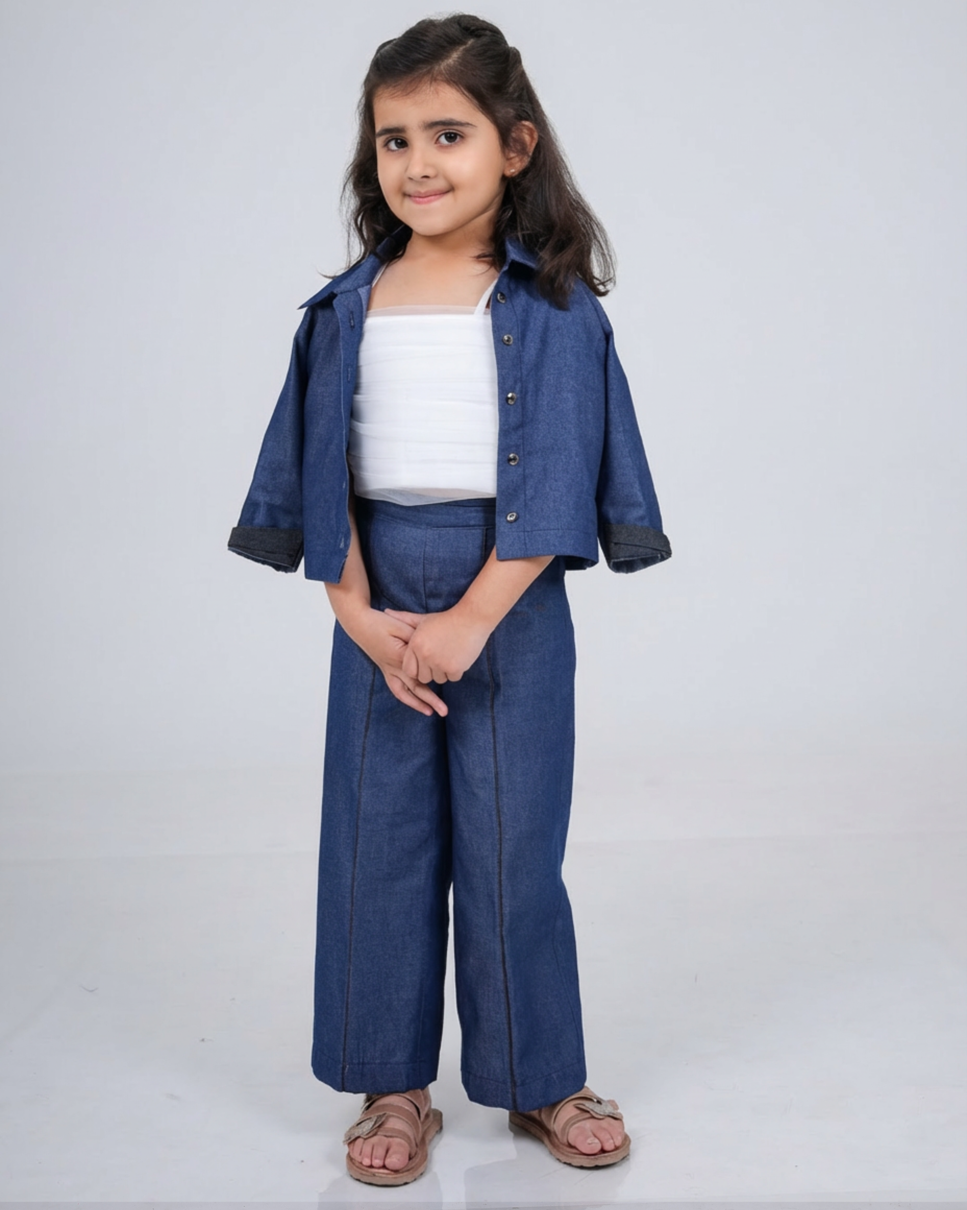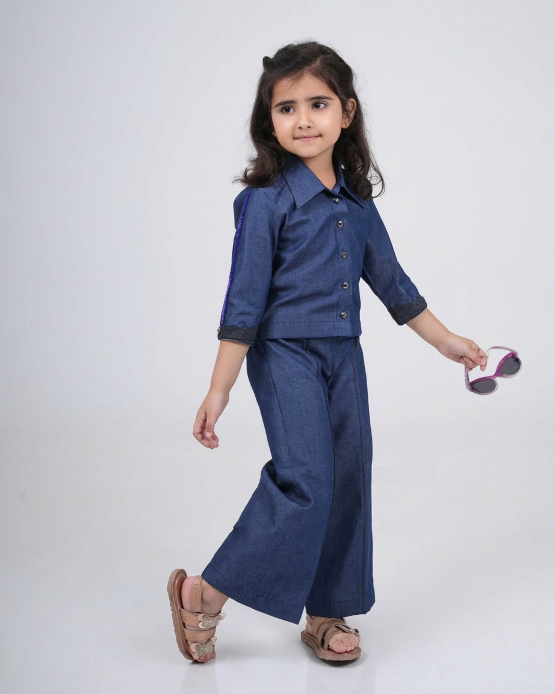 Featuring soft denims, back embellished with cheetah motifs, sleeves embellished, pants having cords at front giving it a perfect look.